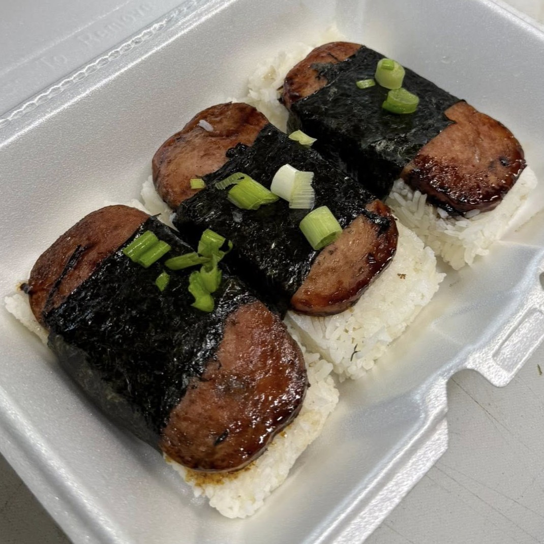 A trio of individually sliced Spam pieces, fried and glazed with teriyaki sauce, served atop rice blocks and wrapped in seaweed.